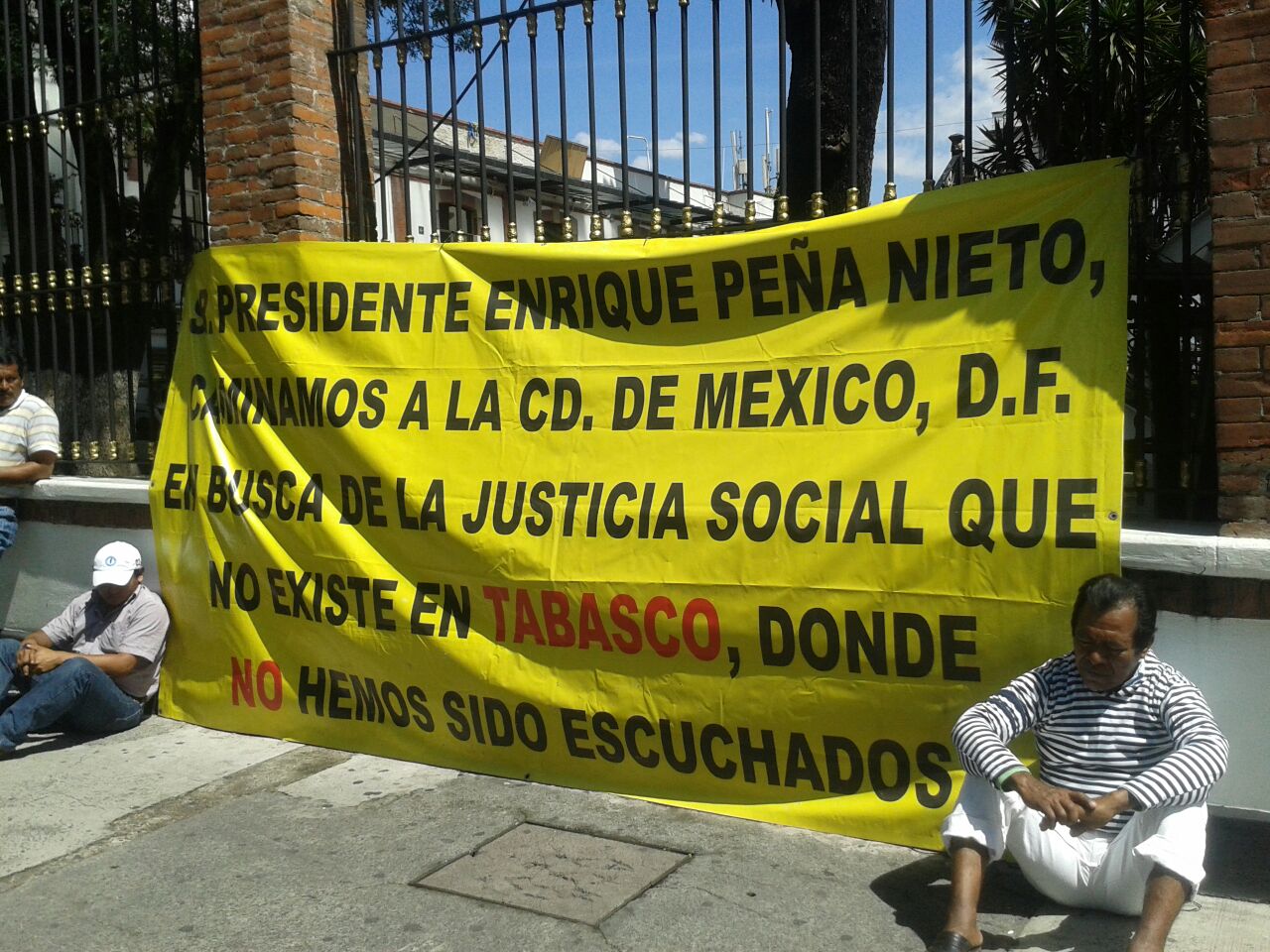 Un grupo pequeño de ellos logró rebasar las medidas de seguridad de la Segob y se instaló afuera las rejas de la dependencia exhibiendo una manta con el texto “Sr. Enrique Peña Nieto, caminamos a la Cd. de México, D. F. en busca de justicia social que no existe en Tabasco, donde no hemos sido escuchados”.