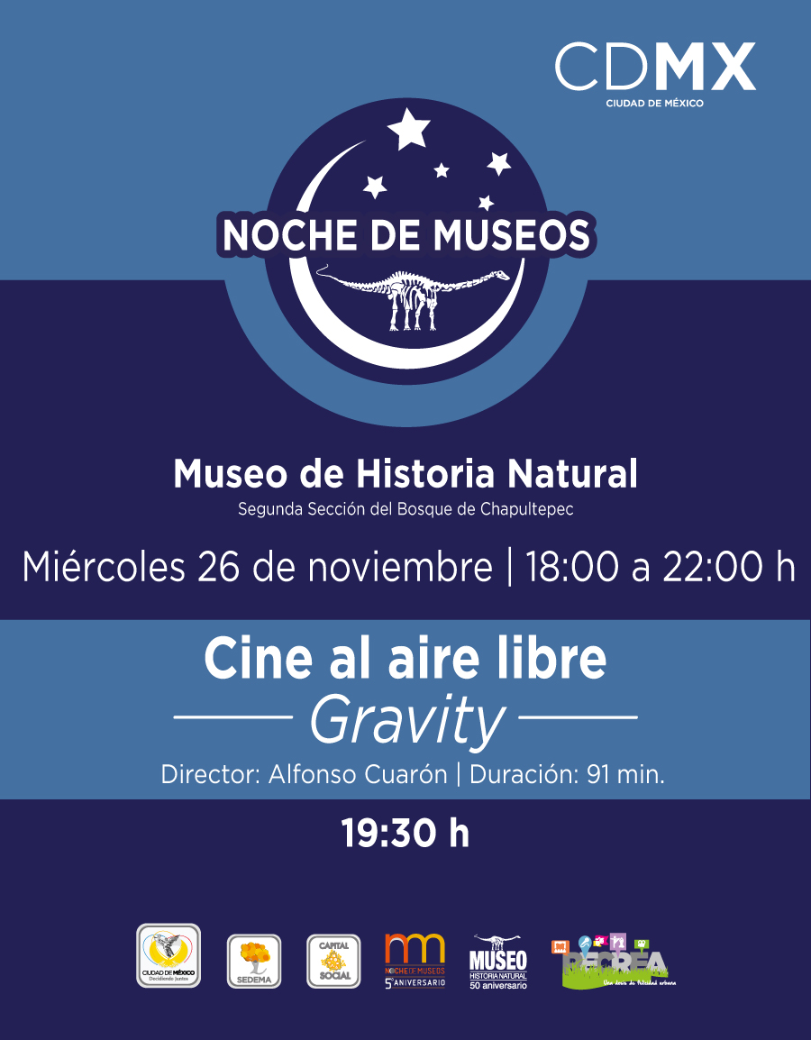 La Secretaría del Medio Ambiente (Sedema) de la Ciudad de México invita a los capitalinos a la función de cine al aire libre en las instalaciones del Museo de Historia Natural, en el contexto de la Noche de Museos que se desarrollará el miércoles 26 de noviembre a partir de las 19:30 horas.