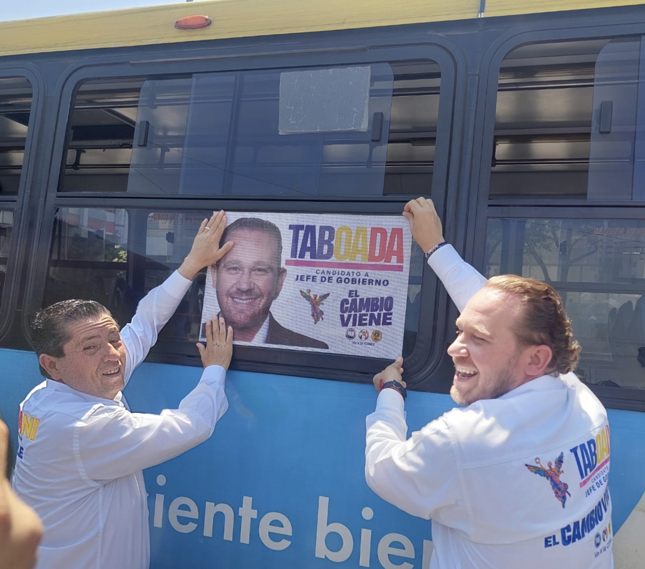 El abanderado del PAN, PRI y PRD, realizó pega de propaganda en las unidades del transporte público.