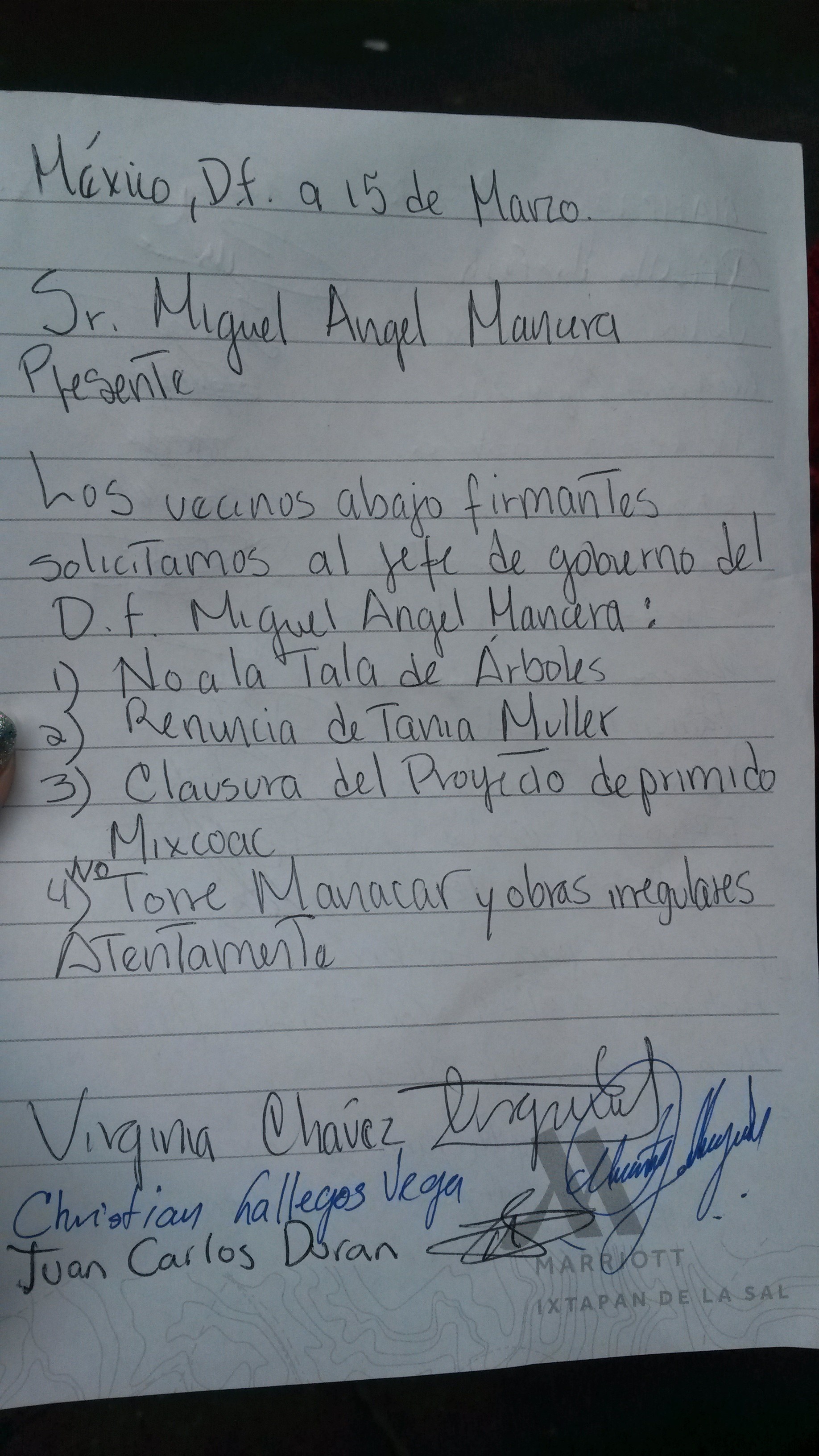 Los vecinos elaboraron un documento en el lugar para hacerlo llegar al mandatario capitalino, donde le piden la cancelación de la obra vial y la destitución de la funcionaria local, entre otras cosas.