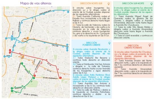 Para los viajes de largo recorrido las vías alternas son: Miguel Ángel de Quevedo, Vito Alessio Robles, Eje 6, 7, y 8 Sur, Periférico y Viaducto.