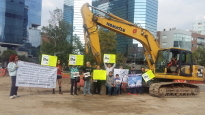 Los vecinos realizaron una clausura simbólica de las obras del Deprimido Mixcoac, colocándose frente a una retroescabadora y teniendo de fondo árboles de jacarandas secos.